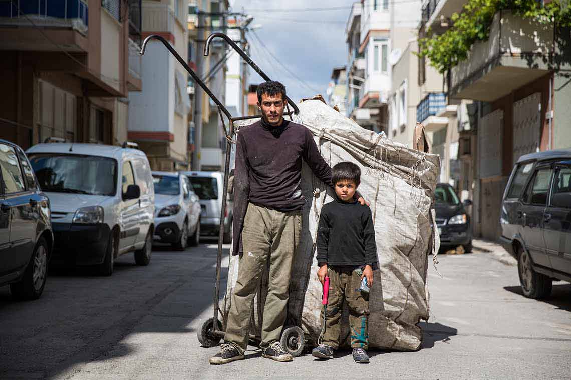 Firas och hans son Uday, 7 år, samlar sopor i staden Izmir i Turkiet. Familjen flydde från Aleppo i Syrien för 16 månader sedan, när deras hem förstördes i en granatattack. Familjen bodde åtta månader i Sanliurfa innan de flyttade till Izmir.