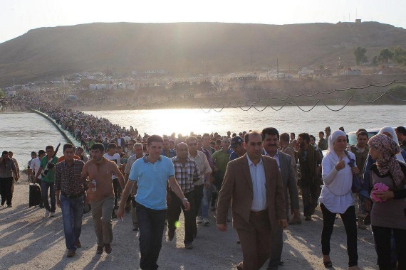 Under helgen fortsatte människor strömma över bron. 15 000 syriska flyktingar rapporteras ha tagit sig över gränsen mellan Syrien och Irak under helgen.