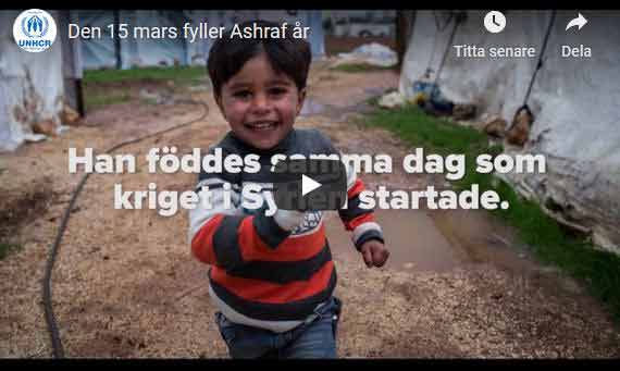Den 15 mars fyllde Ashraf 5 år, samma dag som kriget i Syrien. Hans familj flydde från bomber i Homs. Efter tre år i tält i Libanon, är de nu i säkerhet.