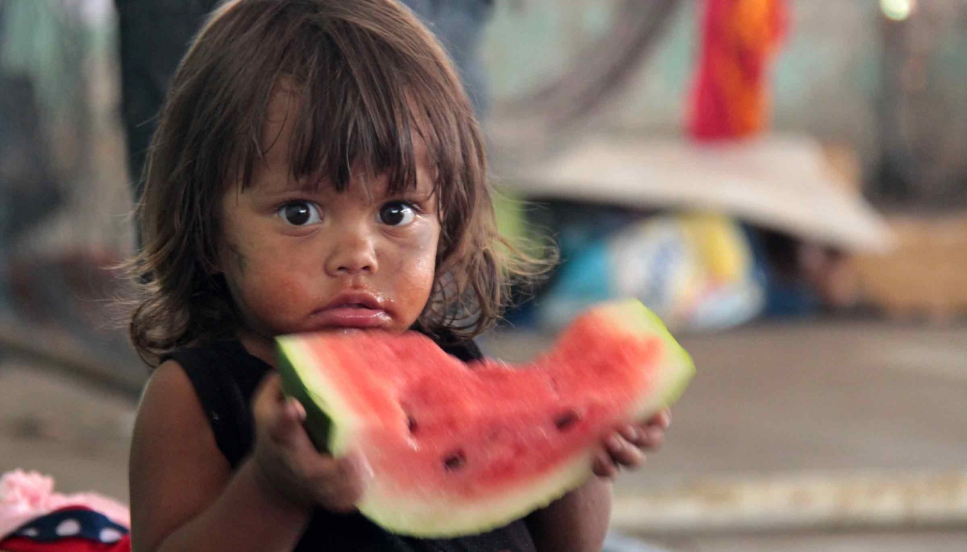 Ett flyktingbarn från Venezuela har fått en vattenmelon.
